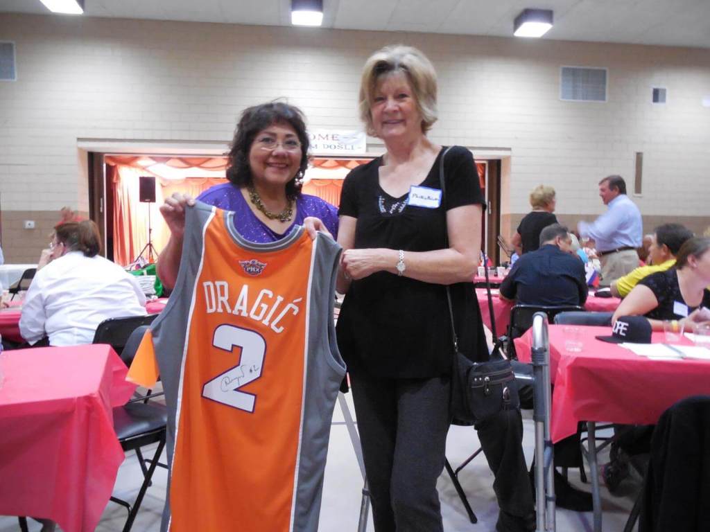 Pictures from the 2015 Slavic Dinner include a display of Slavic Traditional Kolo Dancing. Left to right: Slavic guests doing traditional Kolo Dancing, Nick Vudrag and his Tamburitza Orchestra; Patsy Elmer of Big Time Jersey with Phillis Blake who won Sun’s Player Dragic’s jersey in the Silent Auction; Guests enjoying traditional chevapi dinner.