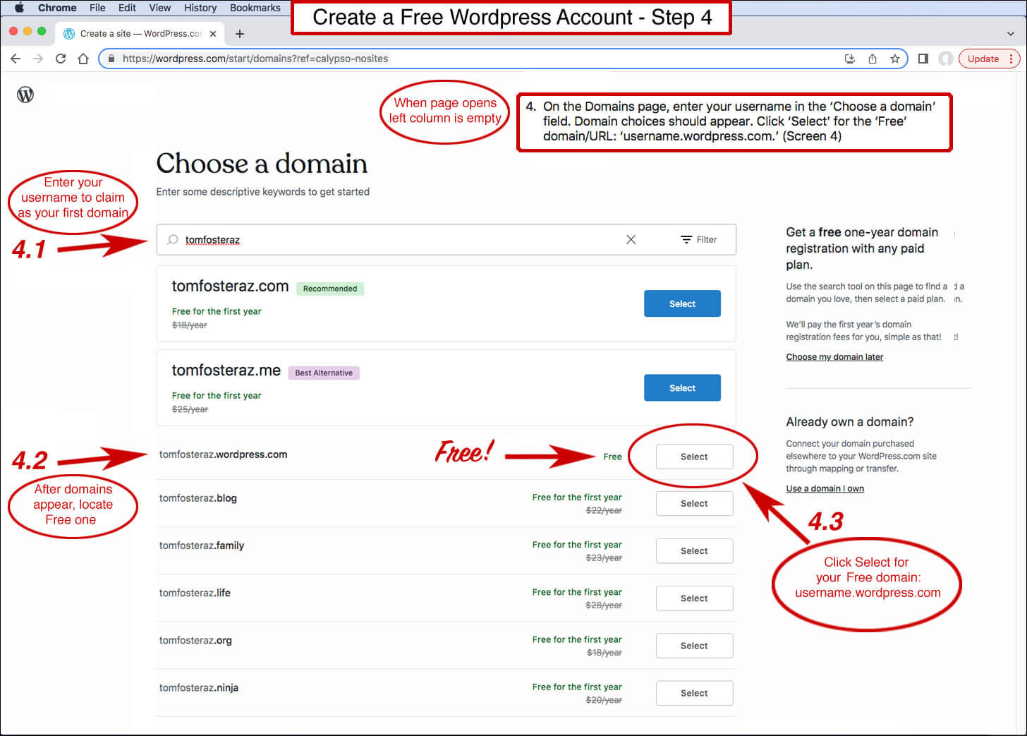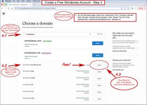 On the Domains page, enter your username in the ‘Choose a domain’ field. Choose ‘Select’ for ‘Free’ domain/URL: ‘username.wordpress.com.’ (4th image)